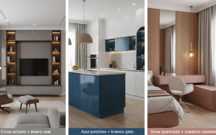 Já as paletas inspiradas na natureza continuam fortes. Tons de terra, verde e azul suave ajudam a criar uma atmosfera tranquila e convidativa, perfeita para quem quer um ambiente com cara de pausa.