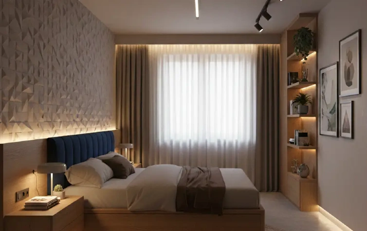 No dormitório de casal planejado e pequeno, o foco está na otimização do espaço. Cores claras, acabamentos uniformes e volumes bem proporcionados ajudam a criar sensação de amplitude. O uso de móveis multifuncionais e layouts inteligentes permite melhorar a circulação e aproveitar melhor cada centímetro do ambiente, sem comprometer conforto ou capacidade de armazenamento.